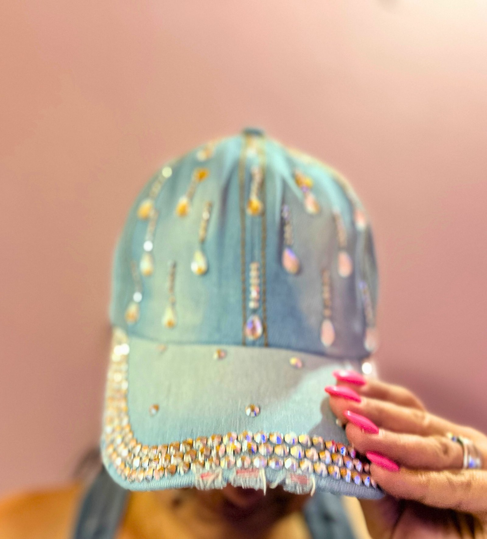 Καπέλο jockey μπλε τζιν με λεπτομέρεια σταγονίτσες και στρασάκια