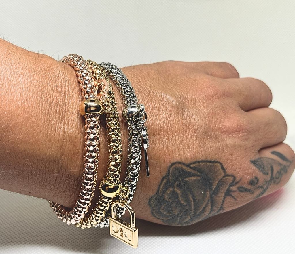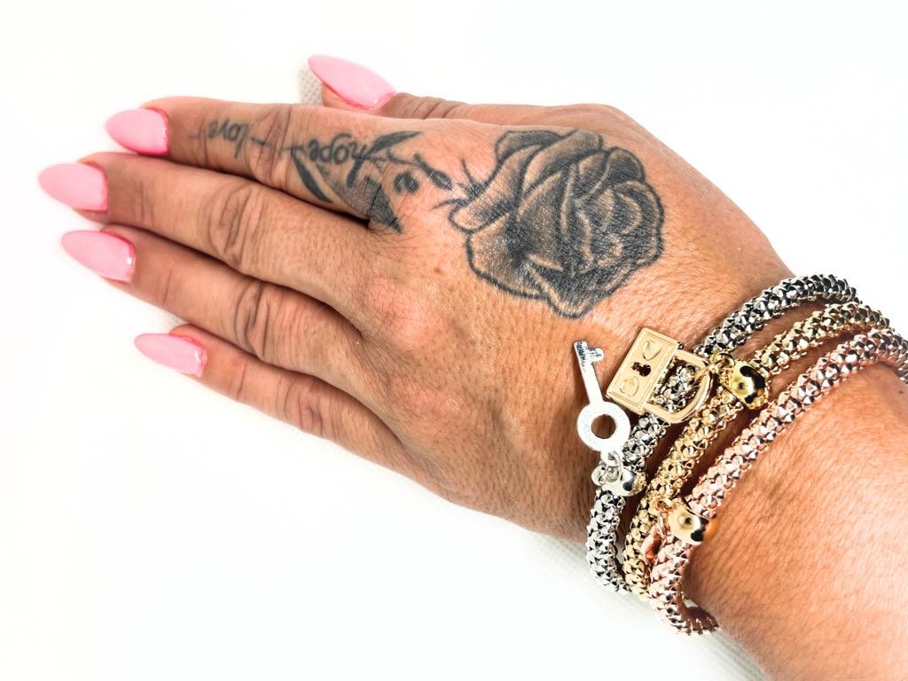 Ένα κομψό και συμβολικό βραχιόλι με μοναδικό σχέδιο κλειδιού και κλειδαριάς, ιδανικό για να εκφράσει την έννοια της αγάπης, της εμπιστοσύνης ή του “μοναδικού προσώπου που κατέχει το κλειδί της καρδιάς”. Κατασκευασμένο με προσοχή στη λεπτομέρεια, συνδυάζει διαχρονική αισθητική με ρομαντικό ύφος.